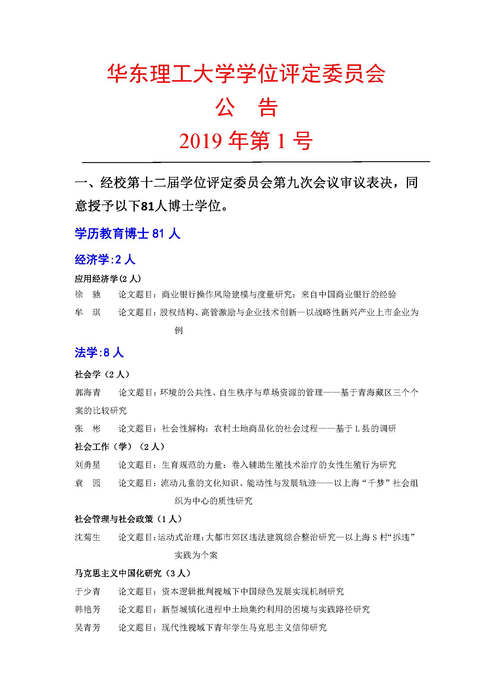 威尼斯wns144777第十二屆學位評定委員會第九次學位授予公告(2019年1號公告)