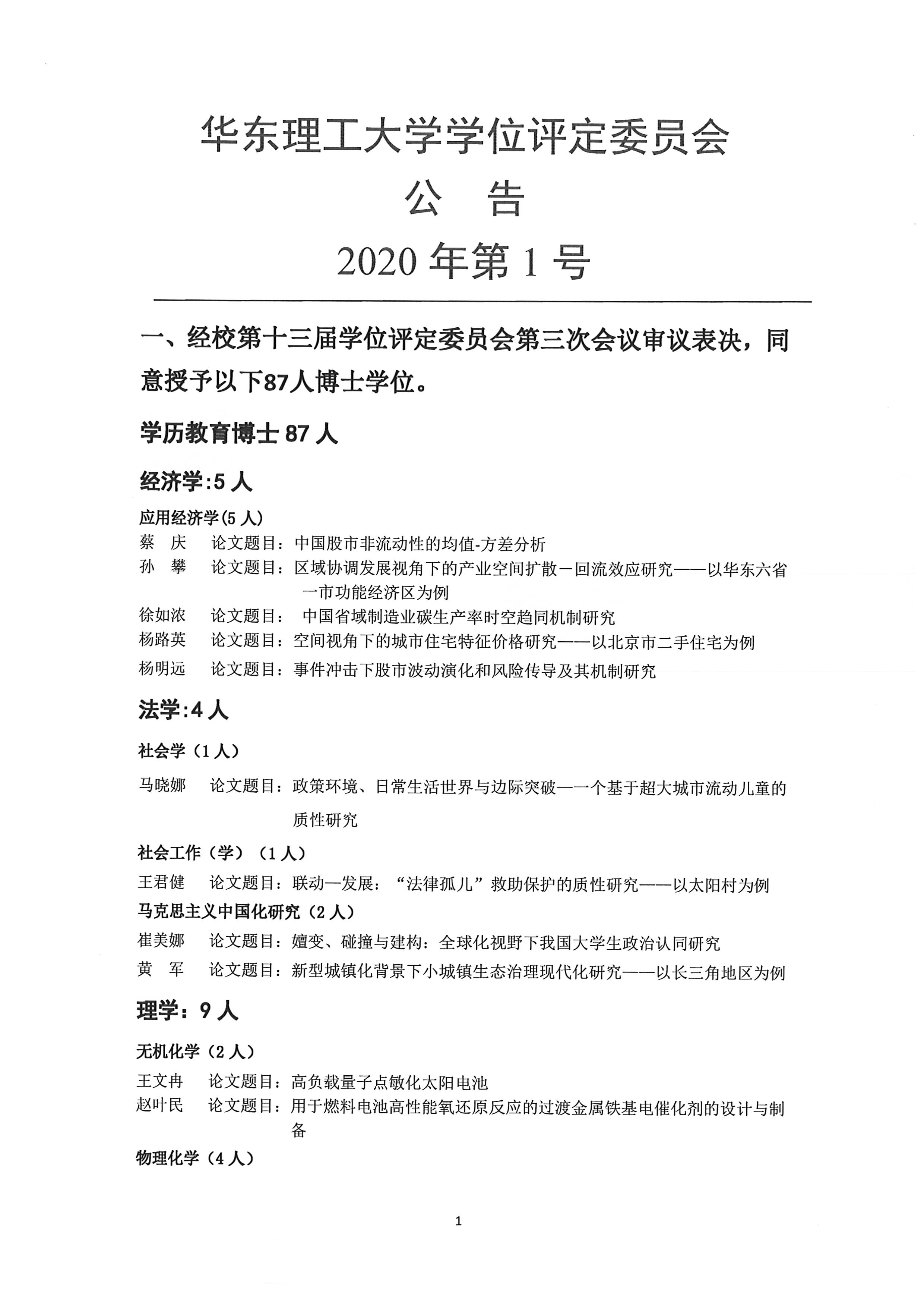 威尼斯wns144777第十三屆學位評定委員會第三次學位授予公告(2020年1號公告)