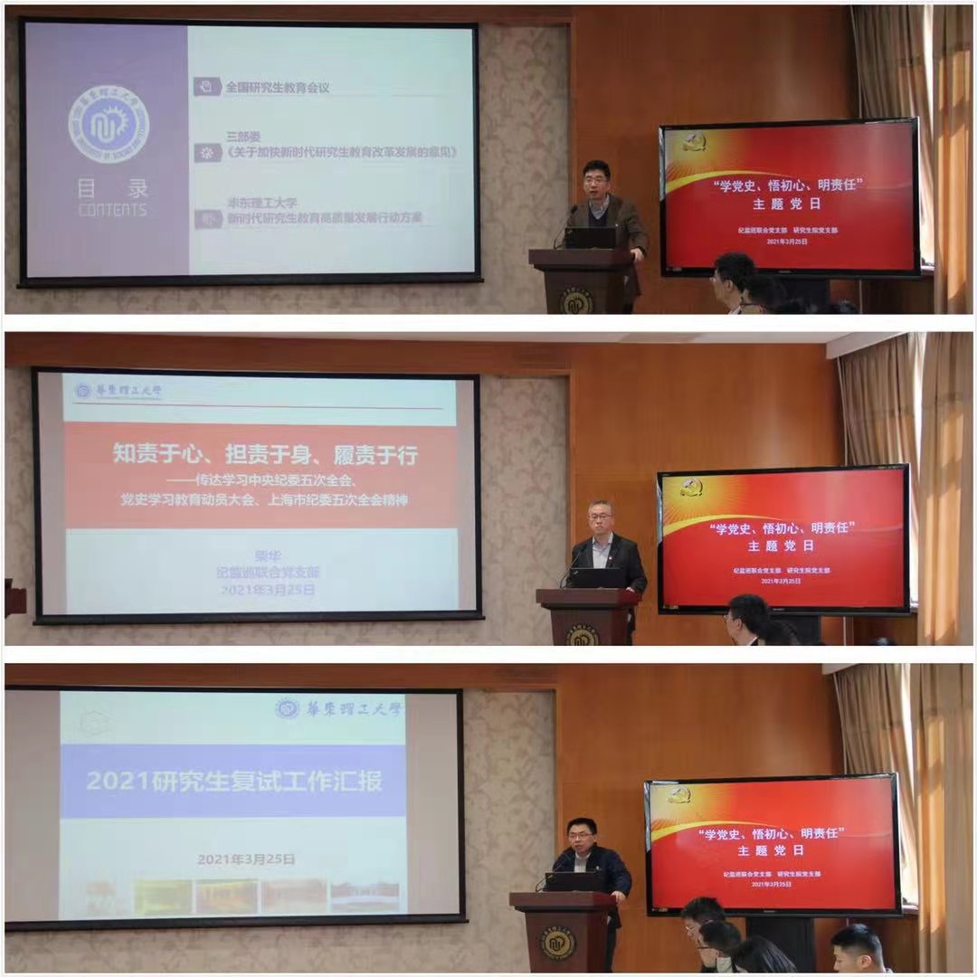 在學習環節,研究生院黨支部書記、研究生院院長龔學慶帶領黨員學習了習近平總書記關于研究生教育的重要指示批示精神和全國研究生教育會議精神,重點介紹了學校推動研究生教育高質量發展的系統謀劃、改革舉措以及研究生教育工作會議籌備情況。研究生院副院長孫洪鋒介紹了我校2021年碩士研究生招生復試情況。紀監巡聯合黨支部書記、校紀委副書記柴華傳達了習近平總書記在十九屆中央紀委五次全會、黨史學習教育動員大會上的重要講話精神以及上海市紀委五次全會精神,梳理分析了黨的十八大以來全面從嚴治黨和反腐敗斗爭取得的歷史性成就,分享了對黨的紀檢監察史和反腐敗斗爭史學習的體會。