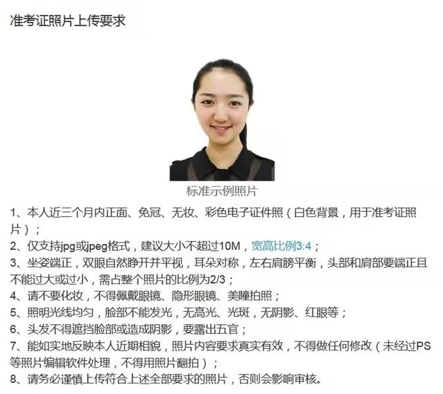 本人近三月內正面、免冠、無妝、彩色電子證件照。該照片將用于初試準考證、錄取登記表、校園一卡通等,請務必按要求上傳。照片要求見下圖(白色背景):