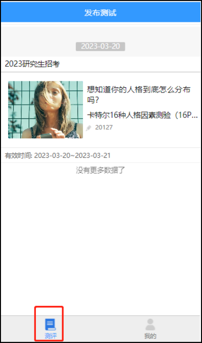 步驟三:完成測試量表。點擊頁面左下方的“測評”,找到“2024研究生招考”,點擊彈出內容進入測試頁面,點擊“開始測試”,完成“卡特爾16項人格因素測試”(下圖以2023年測試路徑為例)。