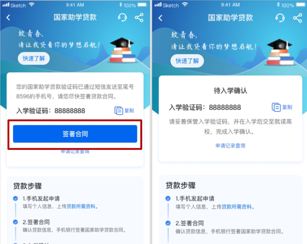 9.學校審核不通過的,同學們可以在補充或修改資料后再次提交申請;學校審核通過的,申請學生將會收到8位數字的入學驗證碼,請登錄中國銀行手機銀行APP輸入入學驗證碼后簽署貸款合同。