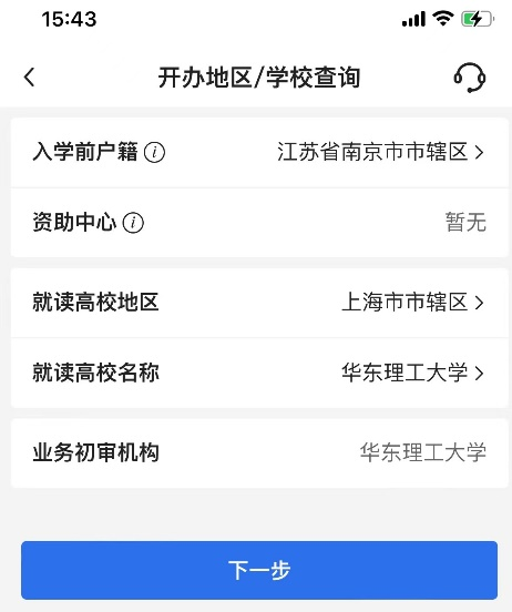 4.依次輸入“入學前戶籍”、“就讀高校地區”、“就讀高校名稱”。 校園地國家助學貸款“業務初審機構”應與“就讀高校名稱”保持一致。
