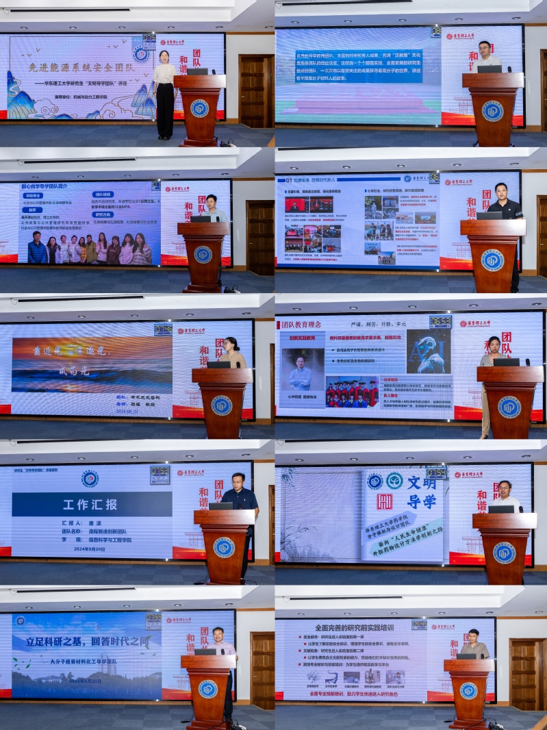 最終,經團隊申請、學院推薦、網絡投票、現場評審等環節,信息科學與工程學院流程智造創新團隊、生物工程學院合成與系統工程導學團隊、材料科學與工程學院AI plus高分子材料導學團隊、機械與動力工程學院先進能源系統安全團隊、化工學院大分子組裝材料化工導學團隊等5支團隊獲評首屆研究生“文明導學團隊”,藥學院分子模擬與設計團隊、社會與公共管理學院群心向學團隊、生物工程學院生物催化與生物合成團隊、體育科學與工程學院體育產業與健康管理導學團隊、化學與分子工程學院有機發光染料團隊等5支團隊獲評提名獎。