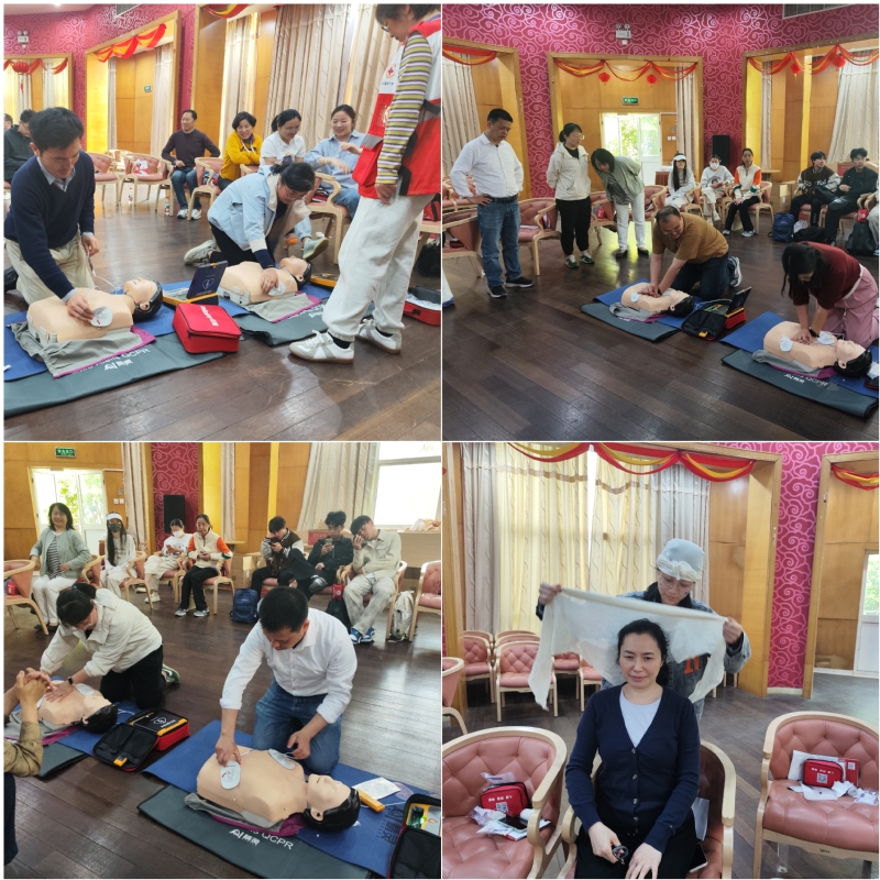 此次培訓采用“理論授課+分組實操+現場考核”的模式。培訓活動開始,徐匯區紅十字會的專業講師通過生動的圖文演示和視頻講解,系統介紹了心肺復蘇術(CPR)和自動體外除顫器(AED)的使用方法和操作指南。講師還重點講解了氣道異物梗阻的識別與處理原則,繃帶包扎、三角巾包扎等創傷救護的規范步驟和注意事項。培訓過程中,徐匯區紅十字會講師運用經典的案例和詳實的數據,使復雜的急救知識變得易于理解、容易上手。
