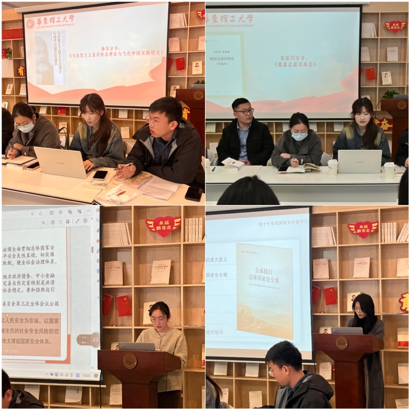 馬克思主義學院2022級博士生孫昊分享了《馬克思主義意識形態理論與當代中國實踐研究》,從馬克思主義意識形態理論入手,結合當代中國實際,闡述了意識形態在國家安全中的重要作用。馬克思主義學院2024級碩士生王貽瑾分享了《全面踐行總體國家安全觀》,結合書本內容解讀了習近平總書記提出的總體國家安全觀,特別強調了從傳統的軍事安全到現代的網絡安全、生態安全等多維度安全的轉變。社會與公共管理學院2023級碩士生王楠結合現代社會風險分享了《風險社會:新的現代性之路》一書。馬克思主義學院2023級碩士生宋欣玥分享了《德意志意識形態》一書的相關內容,從馬克思和恩格斯的歷史唯物主義視角出發,闡述了意識形態在社會結構中的獨特作用。包煒杰和胡博成分別對同學們的分享進行了專題點評,從理論和實踐兩個維度對本次同學們的讀書分享給予了高度評價。
