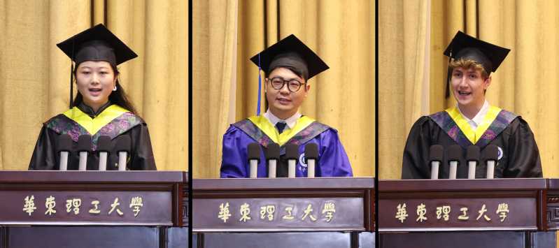 資源與環(huán)境工程學院本科畢業(yè)生趙彬弘代表本科生發(fā)言。她從知行合一的科研探索之路、突破邊界的多維成長之徑、胸懷寰宇的全球擔當之志三方面回顧了在華理的學習成長經(jīng)歷,表達了把個人的理想追求與國家的前途、民族的命運緊密相連的遠大志向。信息科學與工程學院碩士畢業(yè)生張于波代表研究生發(fā)言。作為首批工程碩博士培養(yǎng)改革專項的研究生,張于波分享了在華理和中國商發(fā)校企聯(lián)合培養(yǎng)下,投身國產(chǎn)商業(yè)航空發(fā)動機研發(fā),致力于解決“卡脖子”難題的科研故事,發(fā)出了“以華理所學,鑄國之重器”的誓言。來自意大利的馬浩同學代表留學生發(fā)言。他表示四年留學生涯,讓他愛上了華理,愛上了中國,在每天的日常生活中,他都能看到中國正用科技改變著世界,他愿意做新時代的馬可·波羅,用自己的鏡頭傳播中國聲音,用自己的行動促進文明互鑒。