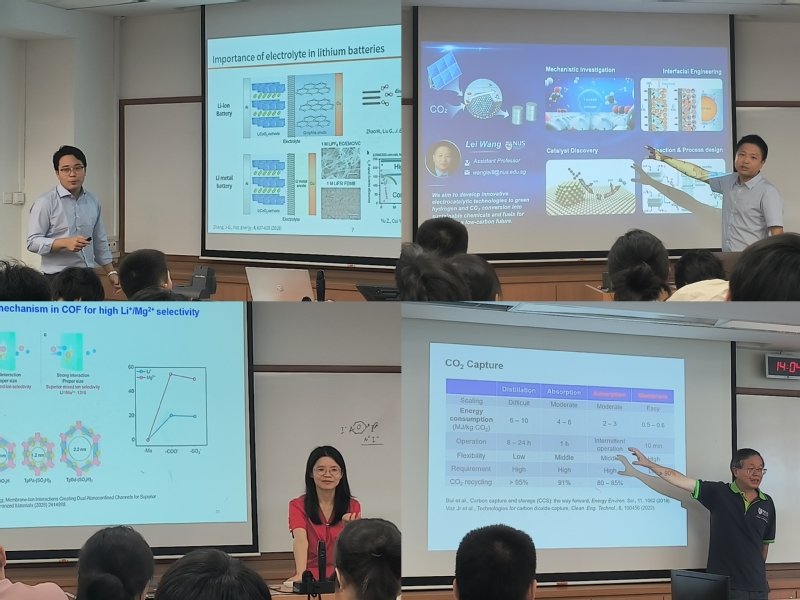 在新加坡國立大學(xué)化學(xué)與生物分子工程系,Sang Cheol Kim副教授介紹了其在人工智能加速鋰離子電池電解液設(shè)計和基于電化學(xué)反應(yīng)調(diào)控pH實現(xiàn)低能耗CO2吸收解吸的最新研究進展;汪磊副教授介紹了電催化研究前沿,從電化學(xué)的基本原理出發(fā)講解了電化學(xué)反應(yīng)裝置的設(shè)計原理以及電催化反應(yīng)的技術(shù)優(yōu)勢;張歲教授講述了她帶領(lǐng)團隊在新加坡水資源循環(huán)利用、海水淡化、溫室氣體治理等方面以膜技術(shù)為核心的解決方案;校友姜建文教授介紹了如何融合傳統(tǒng)分子模擬和人工智能建模新方法實現(xiàn)材料構(gòu)效關(guān)系的精準(zhǔn)建模與高通量定向篩選設(shè)計。